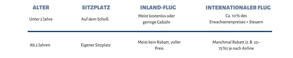 Ist dein Kind unter 2 Jahren, kann es auf dem Schoß der Eltern sitzen und fliegt bei Inlandsflügen meist kostenfrei oder nur gegen eine geringe Gebühr mit.